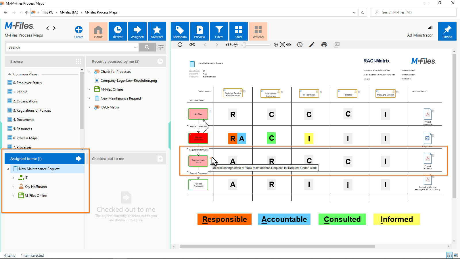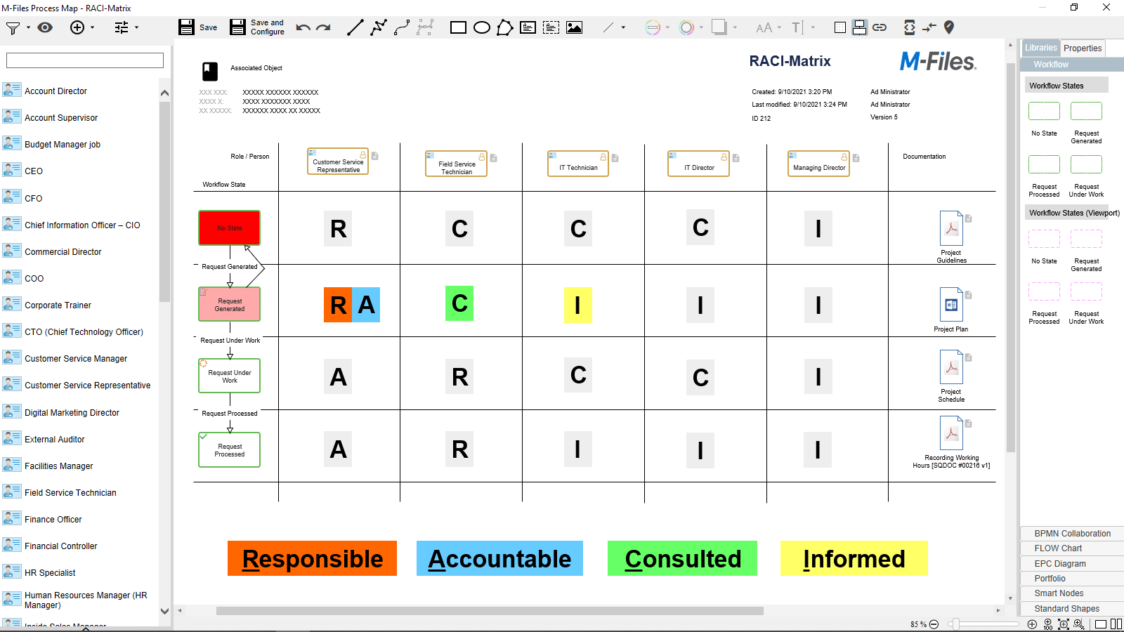 This way, you get a clear description of responsibilities directly in the process flow. Since workflow maps can be bound directly to M-Files objects (see Working with Associated Objects), the RACI matrix is displayed as soon as an object is selected in the M-Files Desktop client. The workflow, whose flow is here located on the left side of the table, can be controlled directly by clicking on the arrows at the workflow steps.