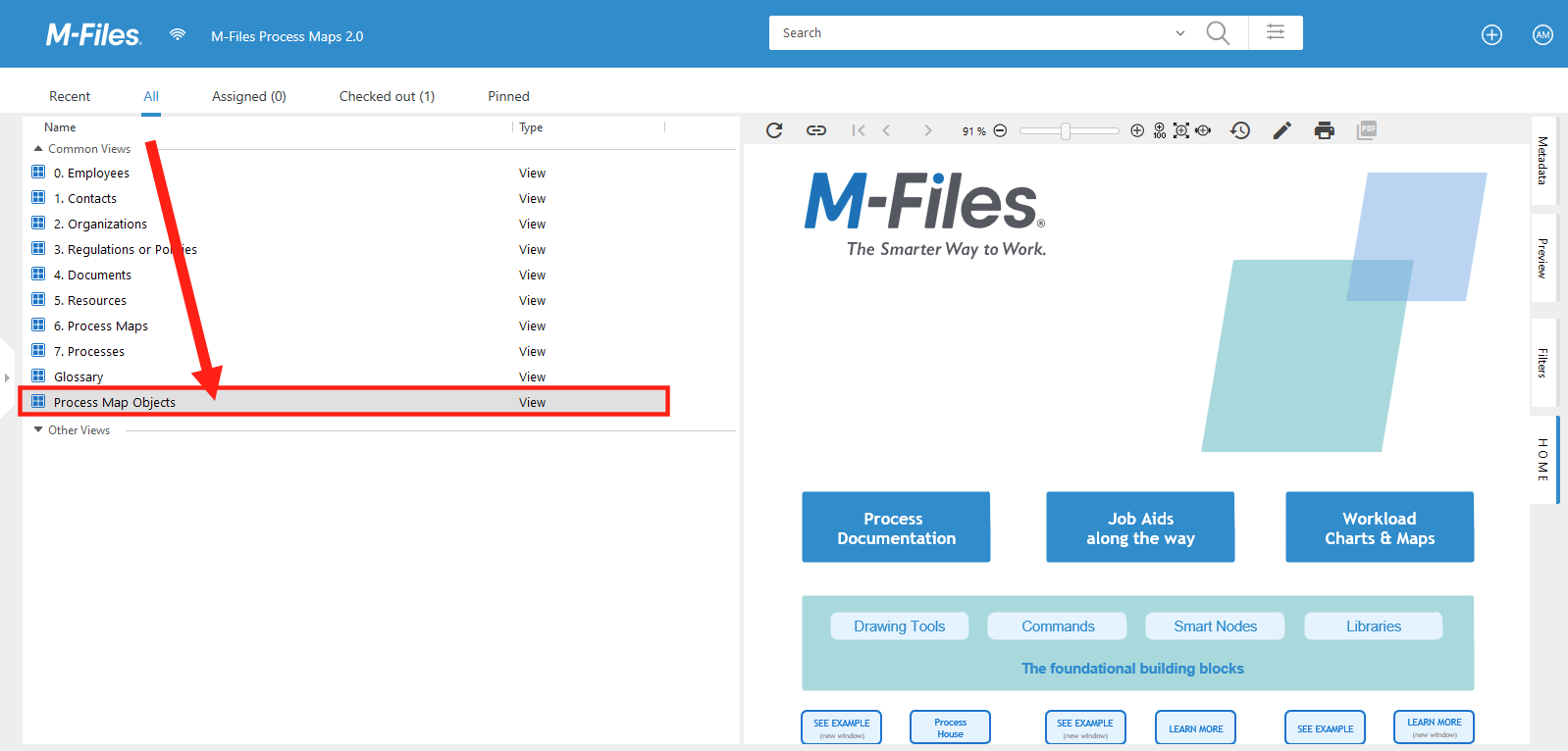 By installing Process Maps to your vault, the system automatically adds a view called Process Map Objects. This is by default positioned in the root view but can be moved elsewhere.