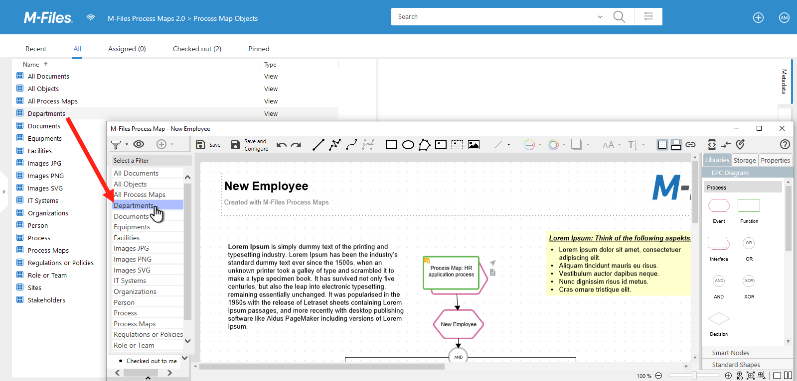 The Process Map Objects View contains other views that return objects that shall be used in the maps (e.g. people, departments, projects) and most certainly documents. In this view, sub views can be created to simplify the selection of appropriate objects in the Process Maps Designer. This is great support for all Designer users.