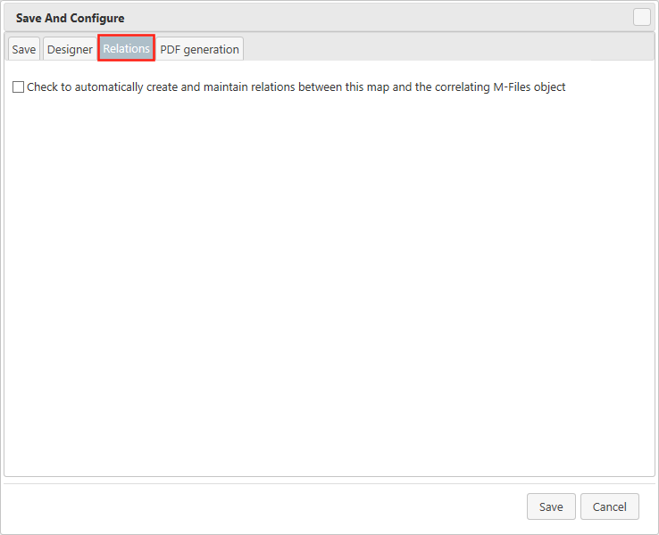 - Use the Relations tab to indicate if all relations from and to correlating M-Files objects in your map are created and permanently maintained when saving. Depending on the number of objects used, this may of course be at the expense of performance. On the other hand, this is a very useful feature, e.g. if you want to see which documents were referenced on which maps or which departments were mentioned.