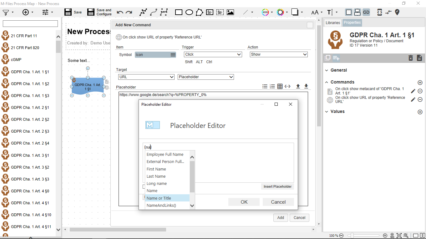 In many cases, it makes sense to work with dynamic URLs so that web services or M-Files object can be called with matching metadata or option parameters. For this purpose, you can also create dynamic hyperlinks in the commands window by integrating placeholders and metadata properties.