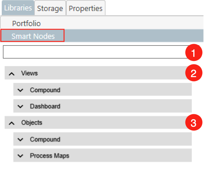 - At the top of the Smart Node library is the search bar. Here you can enter keywords to directly find the Smart Node you are looking for. For example, if you are looking for a chart of the type Gauge, you do not have to scroll through the entire library, but can easily find it by typing its name.