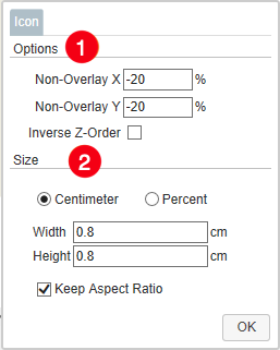 2. Size - set the size for all of the icons. If you deselect Keep Aspect Ratio, you can determine Width and Height independently from one another. You also have the choice between determining the size in centimeters or change it in percentages.