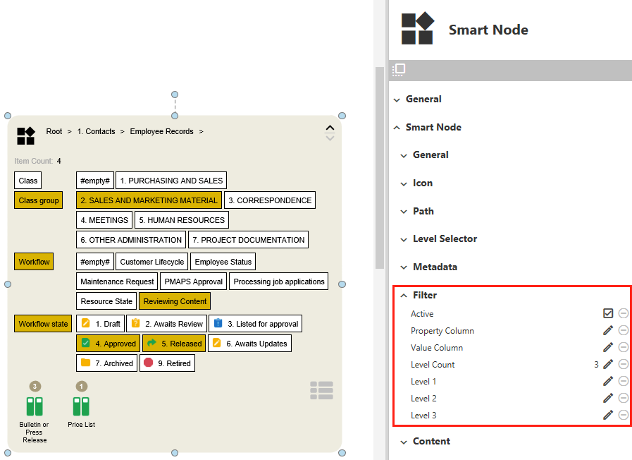 Class,Class group,WorkflowandWorkflow statewhich are even dependent on each other as a hierarchy. - The Value Column provides corresponding values to the selected property. It's important to note that the Value Column appears only when a Property is selected. So, don't worry if it doesn't show up initially when you first use the Smart Node. Clicking on a value will filter the displayed objects in the content area accordingly. Additionally, you have the option to predefine and limit the entries shown here for better management.