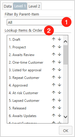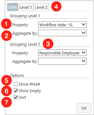 MSorSL), the Level tab is activated. In this tab, you can reduce the considered M-Files objects to certain aspects of the value list and change the order of the groupings.1. Filter By Parent-Item - If there is a Parent-Item for the property you have selected, as is the case for workflow states, for example, you can select it here and thus reduce the list. If the selected property has no parent items, this search bar will be hidden.