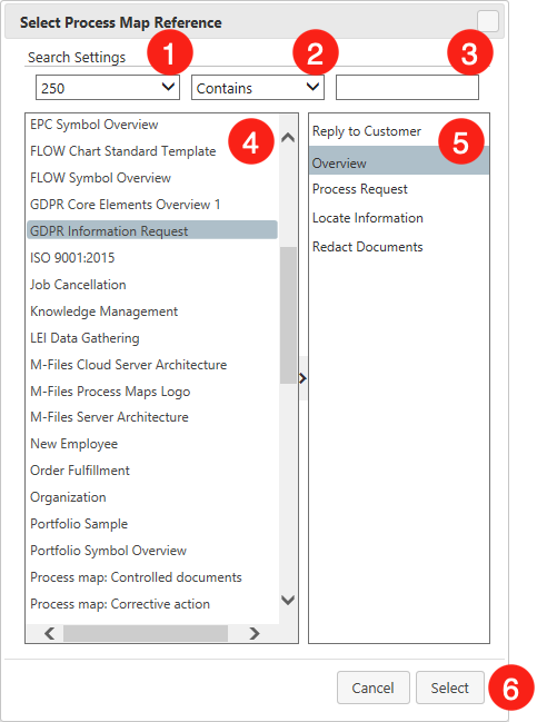 - Process Map Selection - In this section, you can select the Process Map to be displayed by the Smart Node. Please note that by default a maximum of 250 process maps of your vault will be displayed. To limit or extend this listing you have to use the