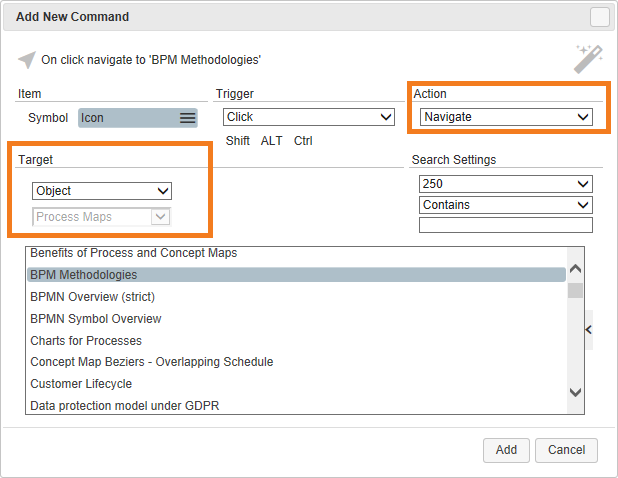 * If you select OBJECT and then choose a process map, you can search and find that map and point to it. The ACTION is automatically set to Navigate.