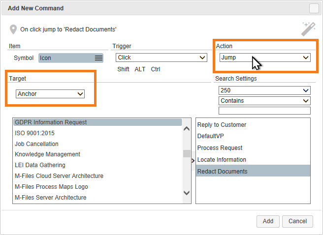 * If you select ANCHOR then you can search and find a process map. When the process map is selected, you can select the anchor on the target object. This automatically sets the ACTION to JUMP.