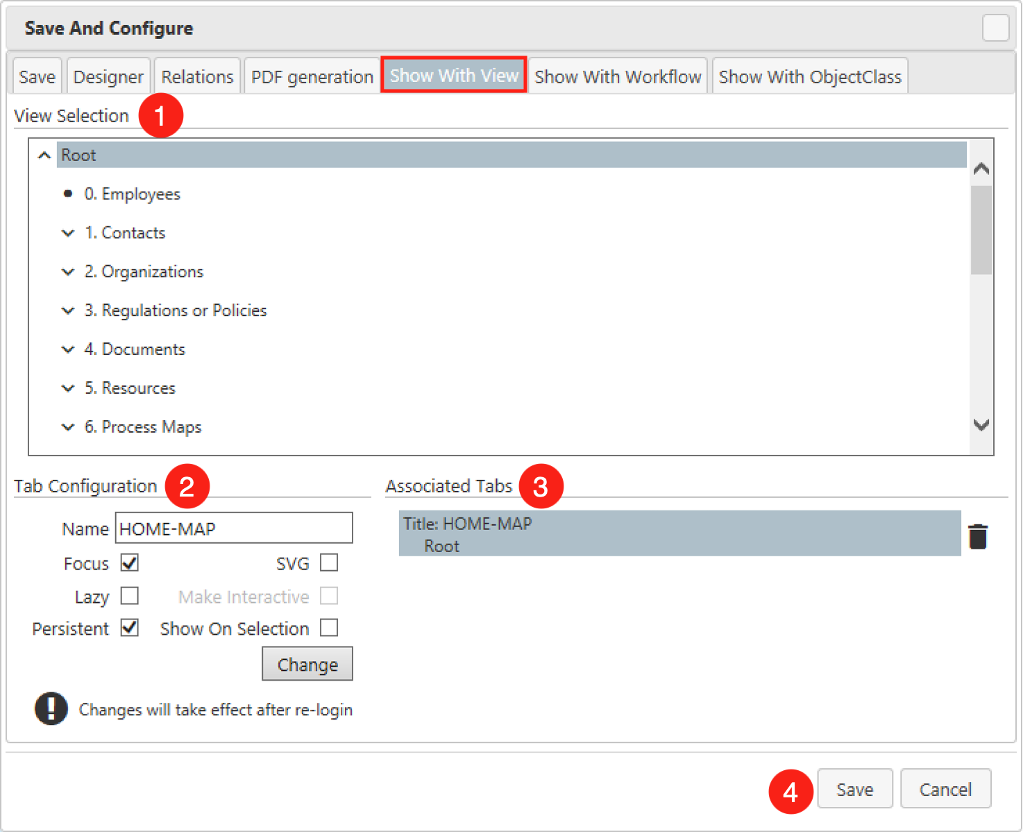 - Associated Tabs - One process map can be associated with multiple tab definitions for different purposes. You see the current configurations listed here. You can use the trash bin to delete an entry. You can select an entry and see the settings. The button below the configuration allows you to change a setting.