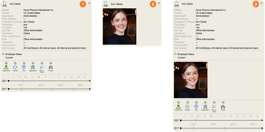 - The Metadata Smart Node contains various information about the linked object. In example, the user gets an overview of the most important metadata of his colleague, Ann Clarke. He knows directly in which workflows and processes she is involved. In addition, the timelines make it possible to logically trace when changes were made to her profile.