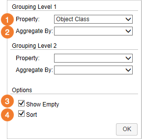- Grouping Level - Here you can specify the criteria according to which the related M-Files objects are to be grouped and sorted. When clicking this menu item, a window will open. In general, you can define up to two Grouping Levels.
