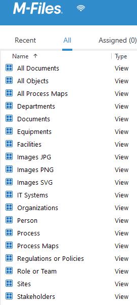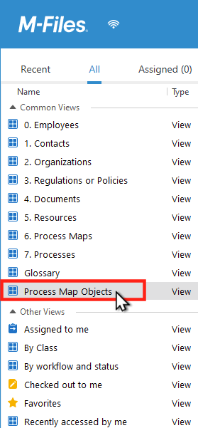 When you freshly install M-Files Process Maps into a vault, the system automatically creates a view called “Process Maps Objects”. This view contains pre-defined views: