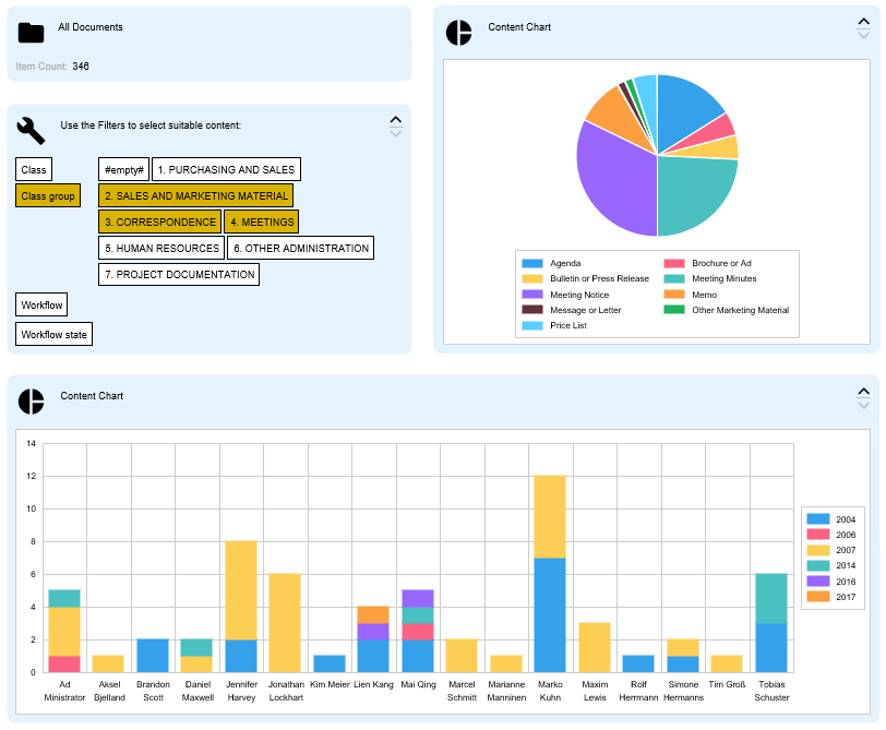 The client-server nature of M-Files with its caching capabilities is perfect for processing the metadata and objects quickly and efficiently. For this reason, it is also possible to further process the queries graphically in the client, either as a bar, pie or line chart or as an aggregated hit list with icons that can be accessed directly with the mouse.