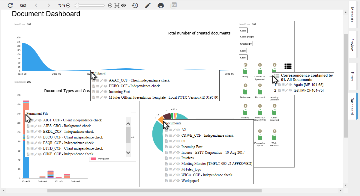 In addition to the graphical representation, this dashboard has another functional feature. When you hover your mouse over the individual sections of the charts, the related documents are displayed.