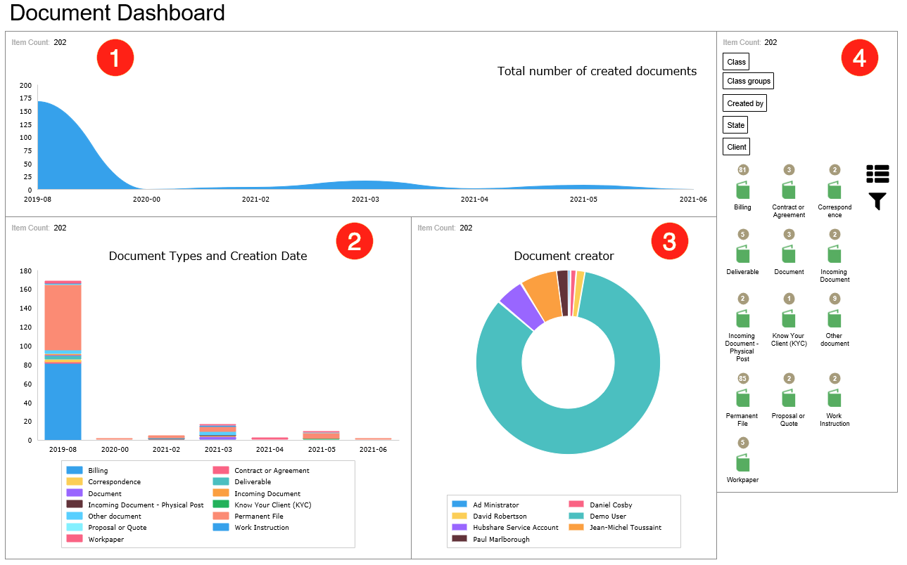 - Area Chart - The top chart shows the viewer how many new documents have been created over the years. This way, the current trend is visible to everyone at first sight.