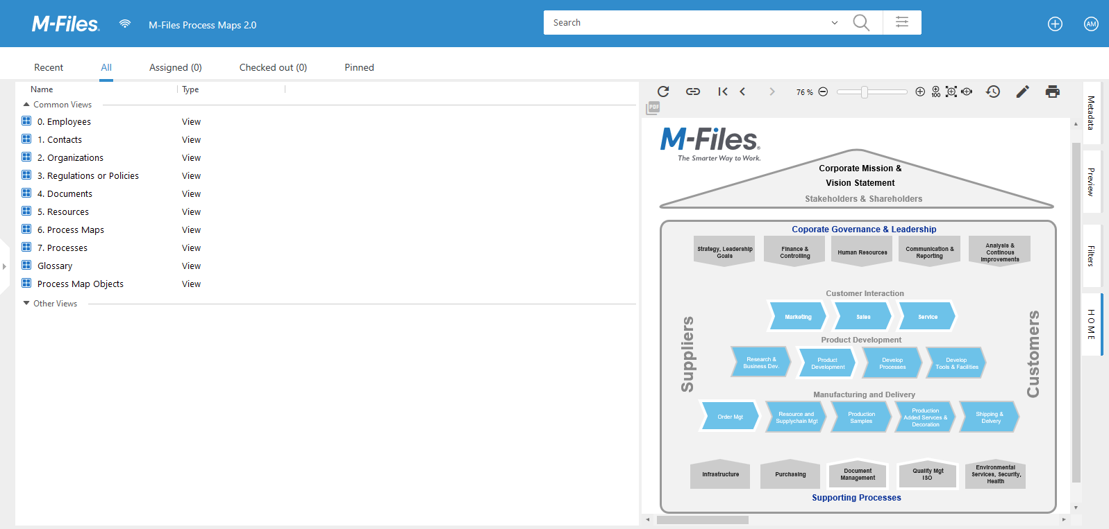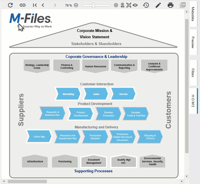 However, the design of a Process House in M-Files Process Maps brings even more potential. Instead of a static picture that only shows the simplified processes, it is possible to go much further.