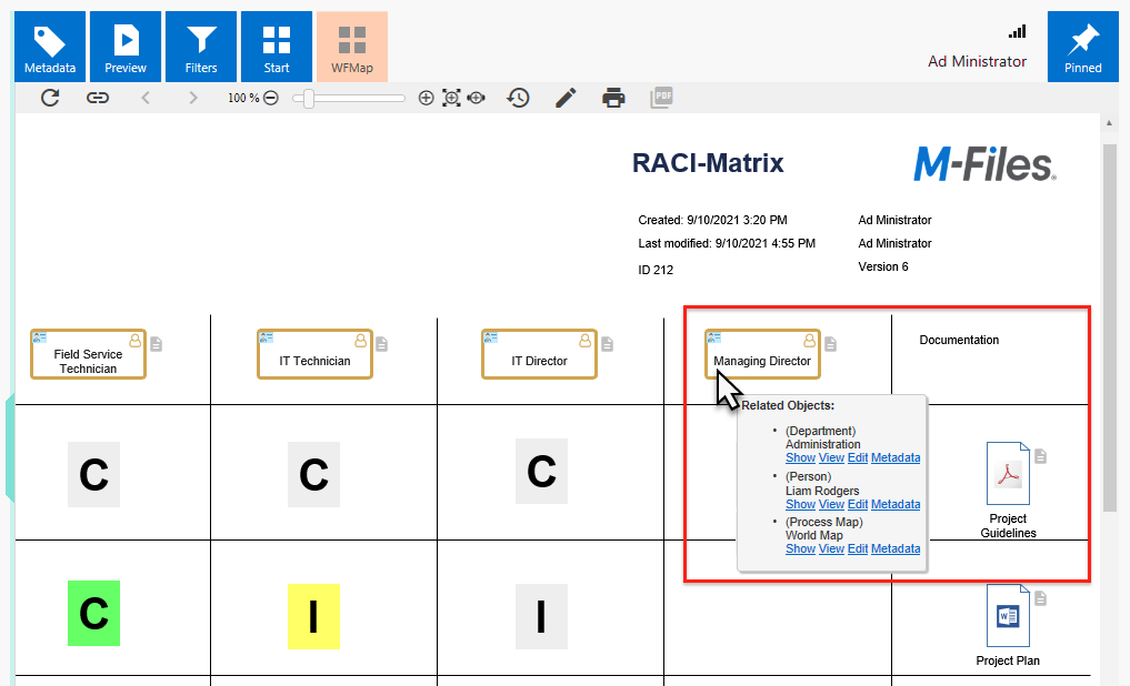 This way, you get a clear description of responsibilities directly in the process flow. Since workflow maps can be bound directly to M-Files objects (see Working with Associated Objects), the RACI matrix is displayed as soon as an object is selected in the M-Files Desktop client. The workflow, whose flow is here located on the left side of the table, can be controlled directly by clicking on the arrows at the workflow steps.