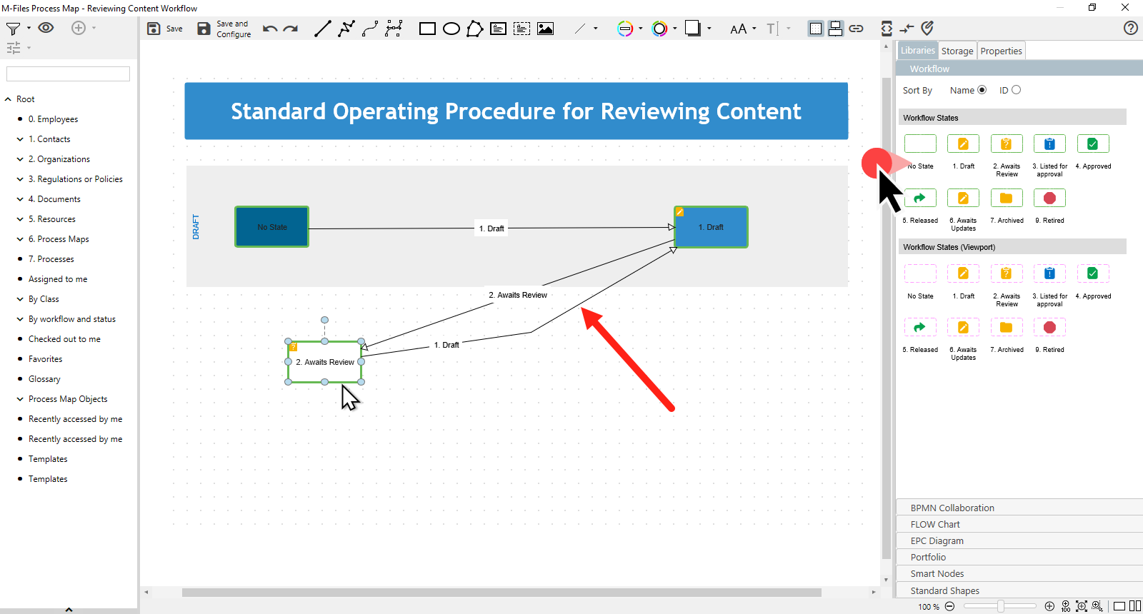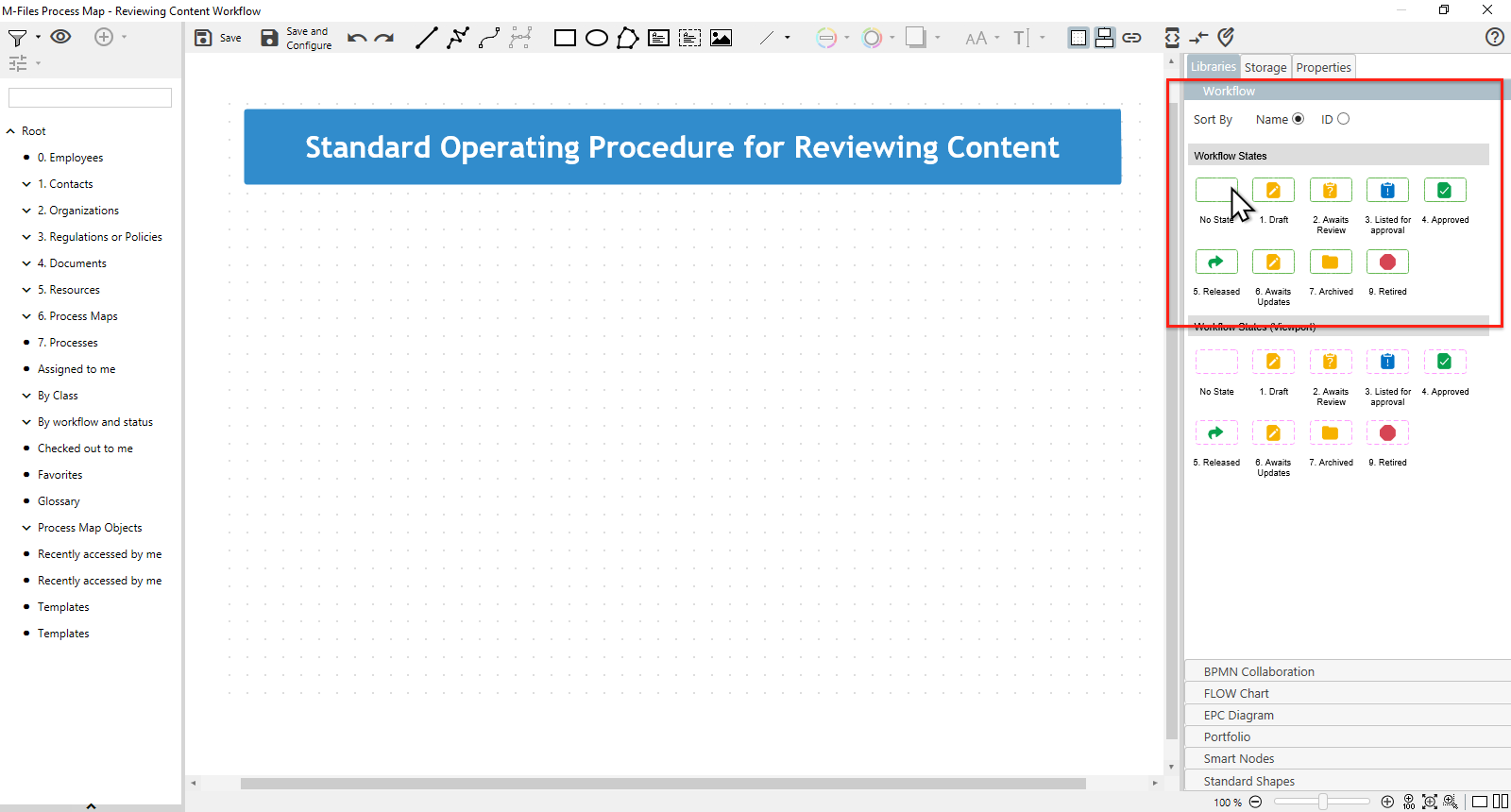 Workflow maps provide the workflow states of the selected M-Files workflow as green symbols in the libraries tab. You can drag them onto the canvas from the right-hand side. Note that every WF state can only be used once on the map.