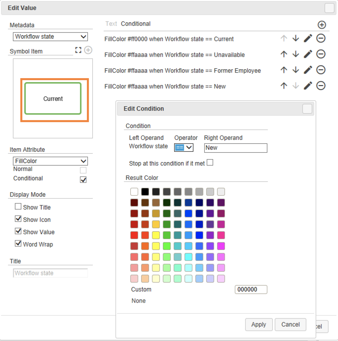 - When you click on the colored box, a color palette will open. From this you can choose how the Current-State, as well as the Next-State should be highlighted.