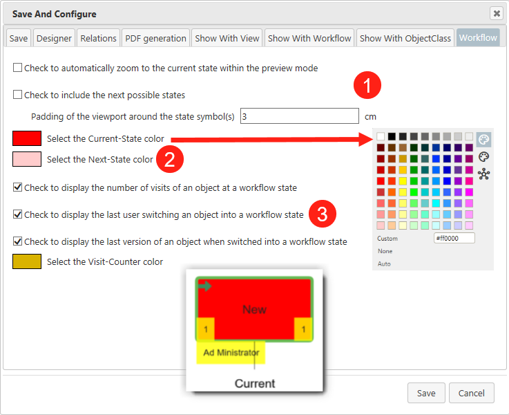 - The following checkboxes enables the display of prior workflow visits in yellow-colored rectangles. This functionality asynchronously loads the history of the associated object and counts the visits for each state.