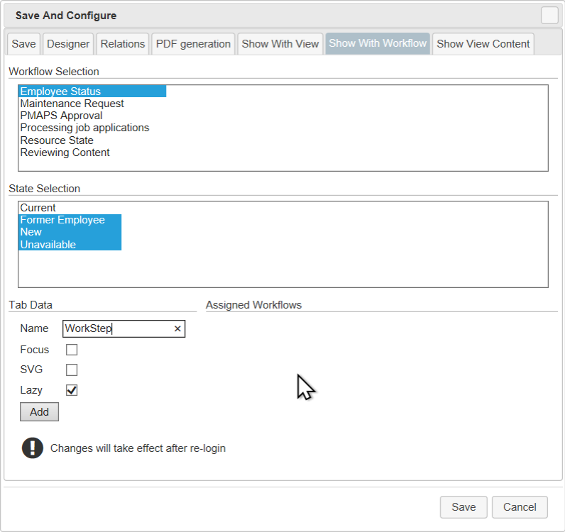 The map will be added to the central configuration and the map display will be executed after re-login when you select an object which travels on the desired workflow path AND is in one of the selected states. A typical use is a tab with “WORKSTEP” that gives you some tips about the current state and where to learn more.