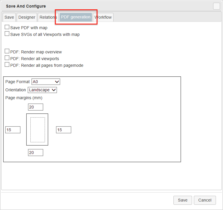 With the help of the tab PDF generation, different representations of the map can be automatically generated when the map is saved: