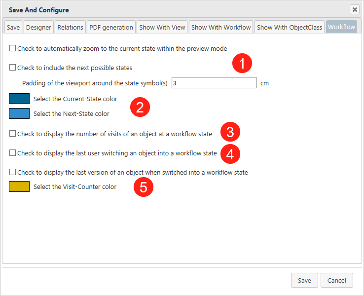 - specify whether the map automatically zooms to the current workflow status and whether the next possible states should be included. Here you can also define the size of the zoom area.