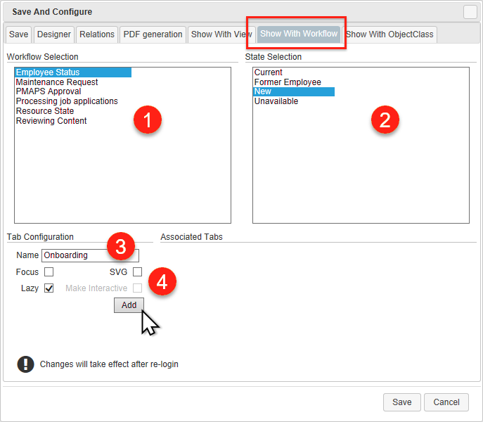 You can select a workflow (1), specify the status (2) in which the tab is to be displayed in M-Files, assign a name (3) to the tab, and define some display options (4):- Focus: the map is directly displayed when an object is marked with the suitable workflow and state.