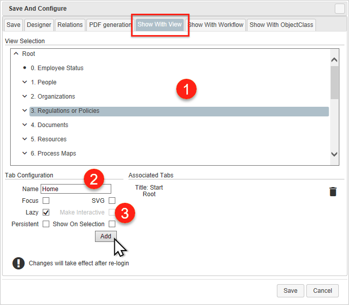 Full control of vaultorManage common views and notification rules) allows to see the map in the Process Map Preview tab if certain views are opened or selected in the M-Files Client. You can select a view (1), specify the name (2) of the tab in M-Files and define some display options (3):- Focus: the map is directly displayed when the view is opened.