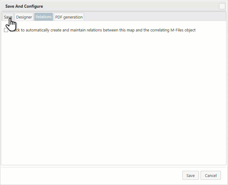 - Use the Relations tab to indicate if all relations from and to correlating M-Files objects in your map are created and permanently maintained when saving. Depending on the number of objects used, this may of course be at the expense of performance. On the other hand, this is a very useful feature, e.g. if you want to see which documents were referenced on which maps or which departments were mentioned.