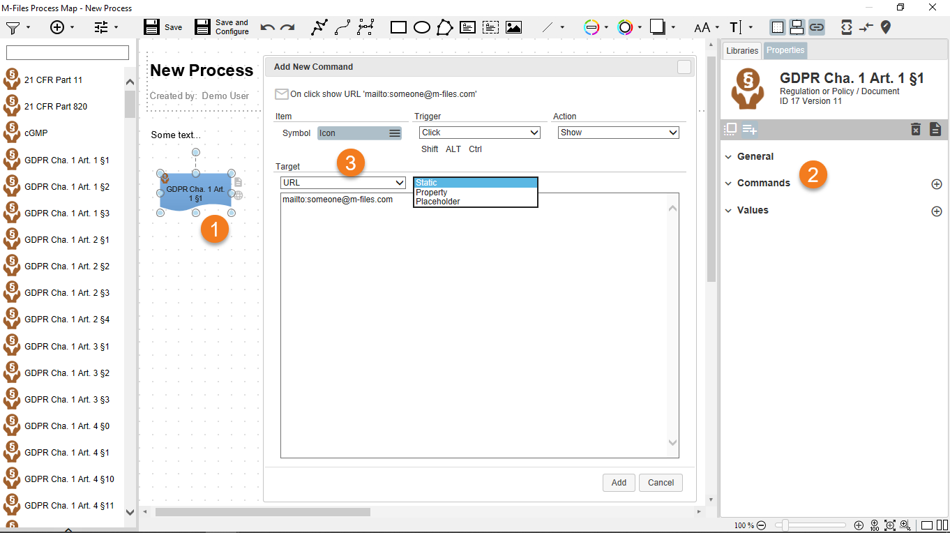 Set a new command on your shape to call a custom uniform resource locator (URL), such as http requests or uniform resource identifiers (URI) as the Mailto schema in your process map (see also Create New Commands):