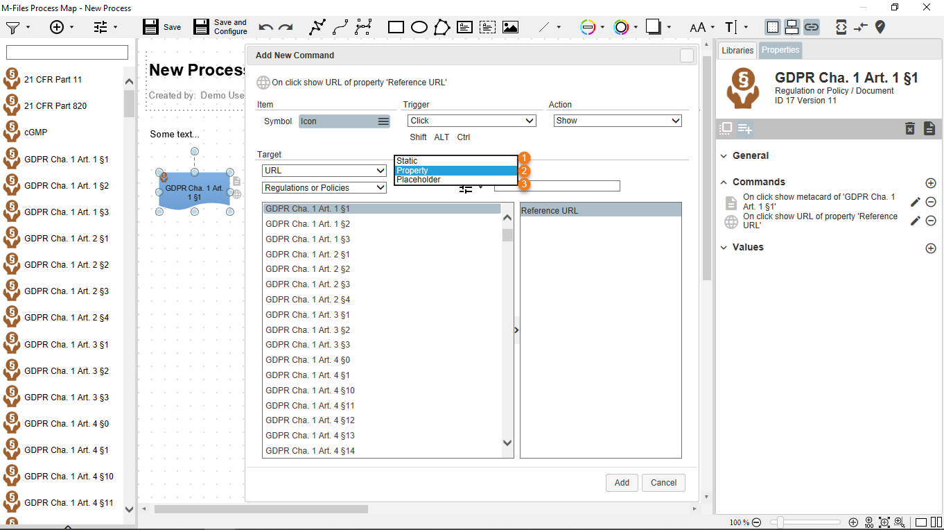 - Property URL (for example, the reference URL of an M-Files object or mailto:): The command calls an URL that is stored on the M-Files object and can be changed there.