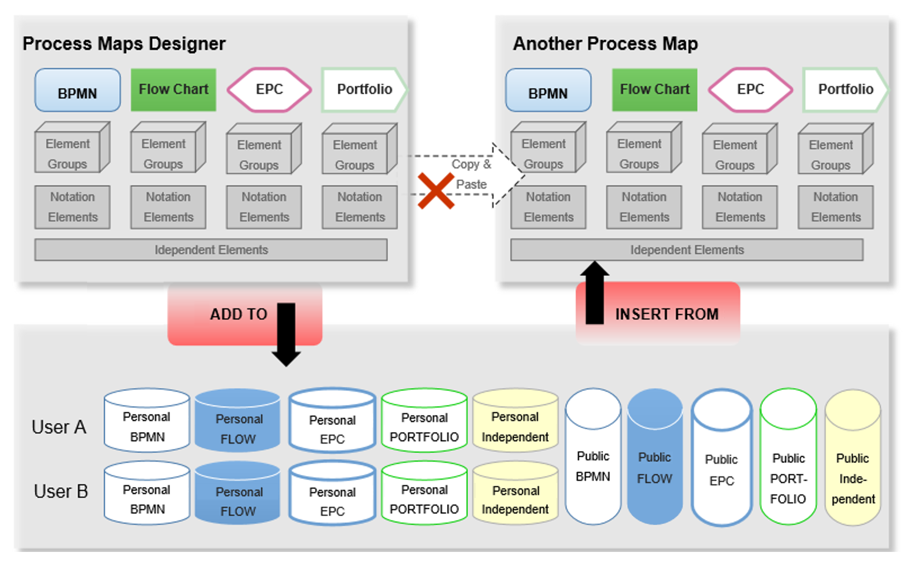 Workflow maps (see Creating Workflow Maps) are the exception here, since they can be used across all notations. They have libraries of all symbol notations. These elements - or groupings of them - can therefore be stored together in a private or public workflow storage.