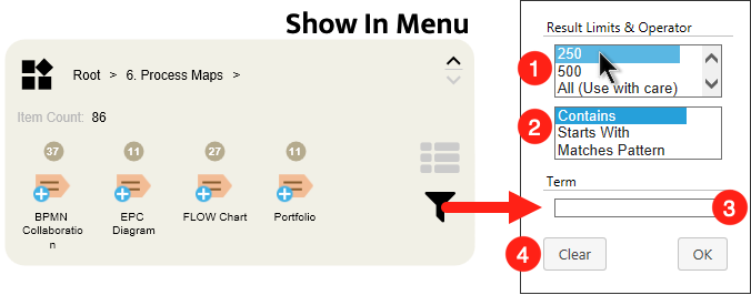 3. Show Result Limit - As mentioned at the beginning, the maximum number of contained items is limited to 250 by default. If you enable this item, the Name Filter will be extended by the item that allows the user to set the limit from predefined values.