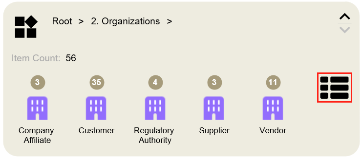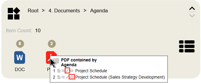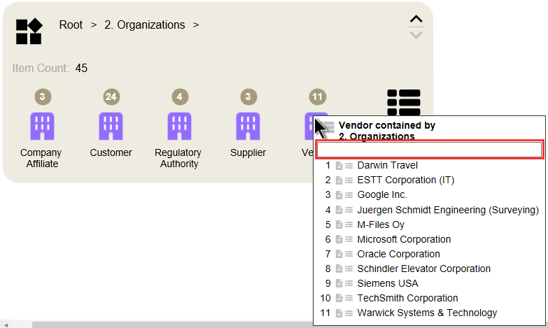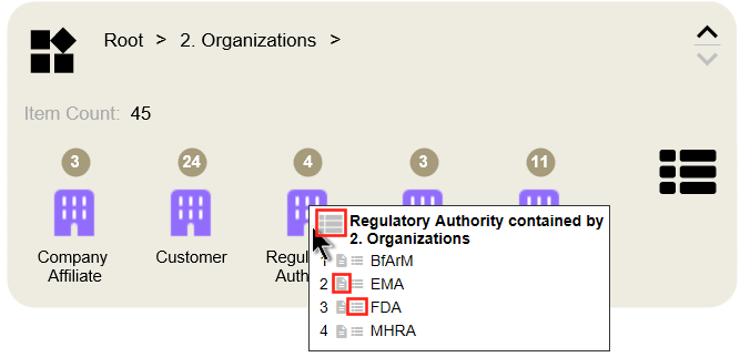 4. List the individual objects, sort them by their object type and identify them by predefined icons. If you hover your mouse over an icon, a list of all the objects contained in the category will open.