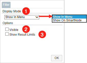 1. Display Mode - You have the choice of displaying the Name Filter either as an icon (Show In Menu), which can be used by a tooltip or directly in the upper area of the Smart Node (Show on Smart Node).