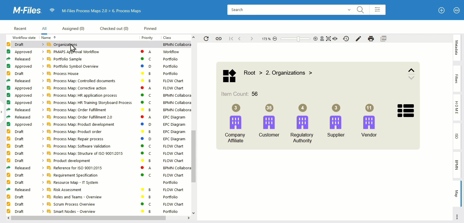 Smart Nodes for M-Files Views allow to evaluate the content of M-Files views and display them within a process map. Since you can have multiple Smart Nodes in a map, you can browse your entire view structure in a clear way and see it all at one glance. In particular new employees will benefit from this newly gained transparency.