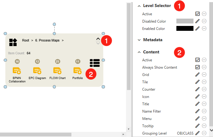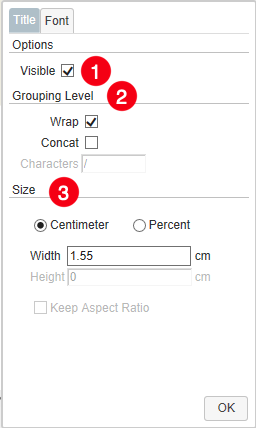 1. Options - The Options area can only be used if two properties have been previously set as Grouping Level. Here the positioning of the two icons can be determined, which is then used for this combination of properties.