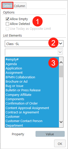 #empty#should appear in the Value List. If a user selects#empty#as a value to filter by, only M-Files objects that contain the previously selected property, but do not have a value set for it, will be considered. Select Allow Deleted to display values which have been deleted at some point in your system. You can identify them by the tag(deleted)displayed behind their name. By default, this option is disabled