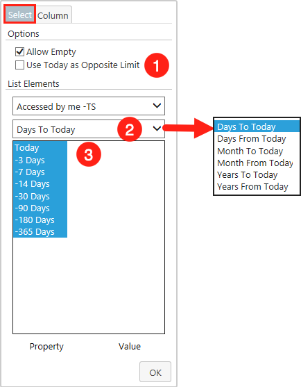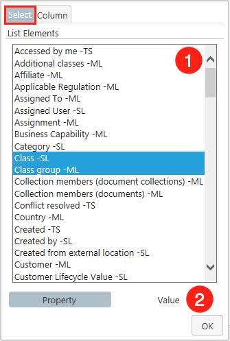 1. Property - The field next to the Property label can be considered as the main feature of the window. Clicking the field will open a list of every property definition included in your vault. When selecting a property definition you have two possible approaches. They can be selected either directly, or in relation to an object type. Therefore, the list is divided into different segments, which are signaled by bold headings.