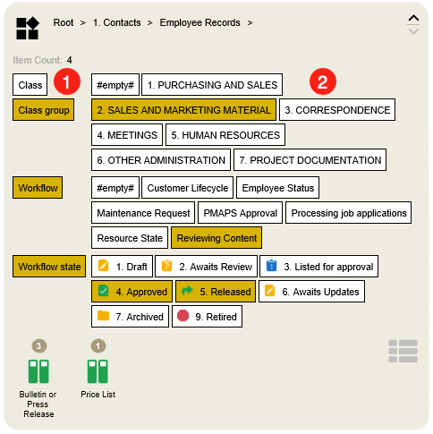 Class,Class group,WorkflowandWorkflow statewhich are even dependent on each other as a hierarchy. - The Value Column provides corresponding values to the selected property. It's important to note that the Value Column appears only when a Property is selected. So, don't worry if it doesn't show up initially when you first use the Smart Node. Clicking on a value will filter the displayed objects in the content area accordingly. Additionally, you have the option to predefine and limit the entries shown here for better management.