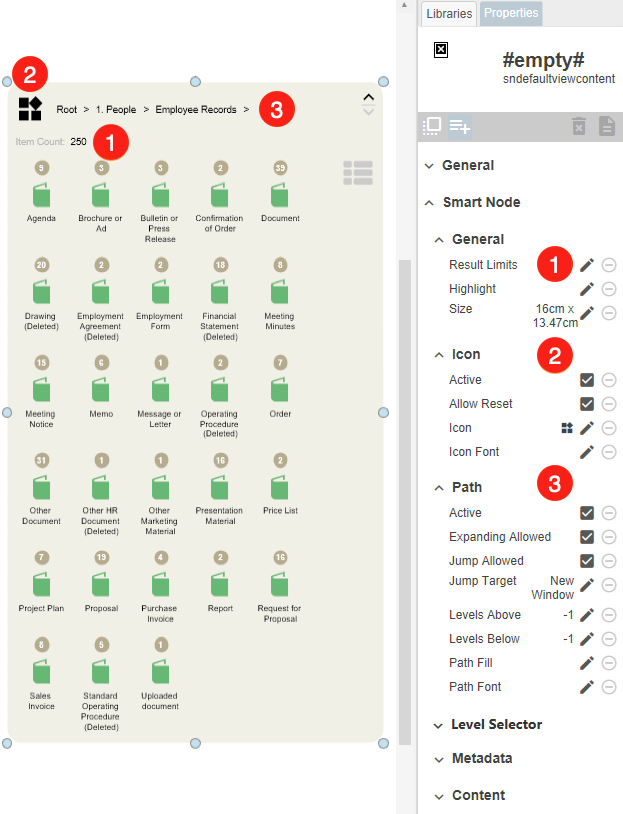 Metadata - The term Metadata refers to the section of the Smart Node which shows the number of objects included in the linked M-Files views. The following adjustments can be made via the Properties menu: