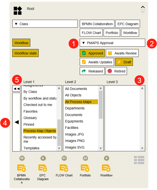 MSorSL), the Level tab is activated. In this tab, you can reduce the considered M-Files objects to certain aspects of the value list and change the order of the groupings.1. Filter By Parent-Item - If there is a Parent-Item for the property you have selected, as is the case for workflow states, for example, you can select it here and thus reduce the list. If the selected property has no parent items, this search bar will be hidden.