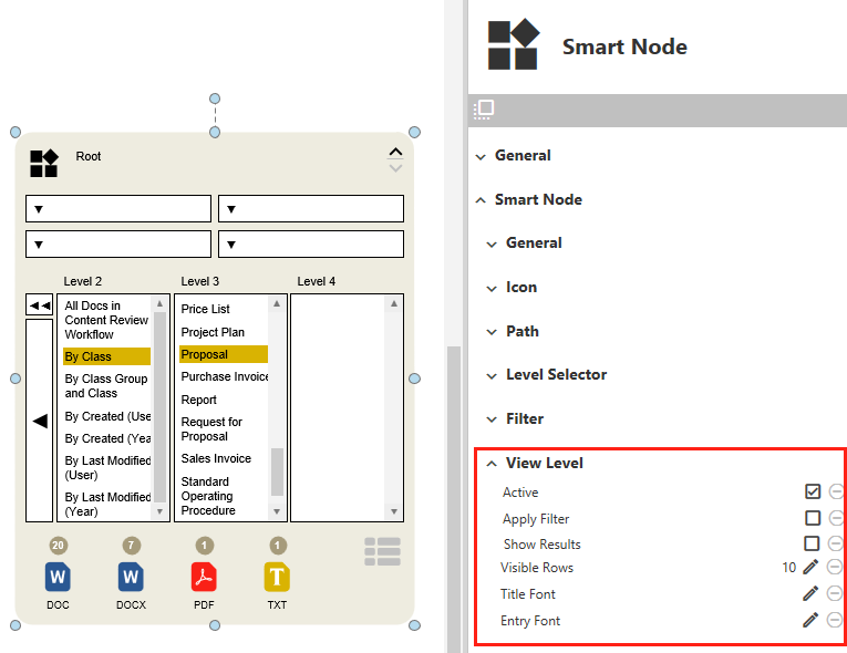 1. Level Selector - Here you can customize the appearance of the buttons to expand ∧ or shrink ∨ the Smart Node.