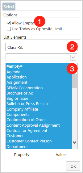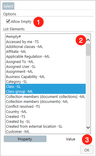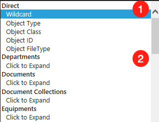1. Property - The field next to the Property label can be considered as the main feature of the window. Clicking the field will open a list of every property definition included in your vault. When selecting a property definition you have two possible approaches. They can be selected either directly, or in relation to an object type. Therefore, the list is divided into different segments, which are signaled by bold headings.