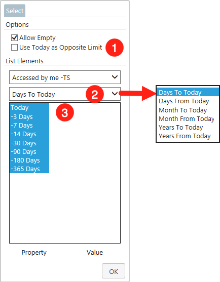 - Use Today as Opposite Limit - If this option is enabled, the filter selection will be limited to dates in the future (Days From Today) only. This should be applied if you are looking for e.g. future due dates of projects or expiration dates of legal documents.