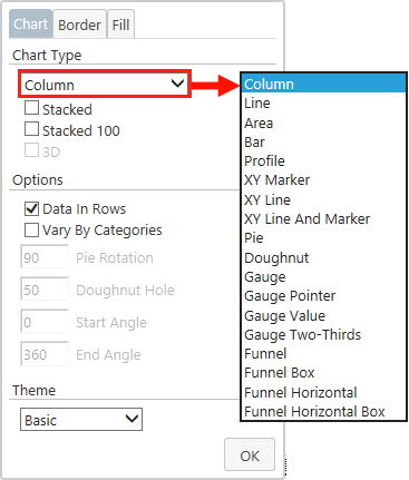 - Pointer Type - This option is only useful if you have selected Gauge Pointer as the chart type. If this is the case, you can influence the appearance of the pointer here. Specifically, you have the choice between
