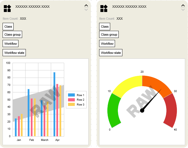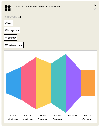 Class,Class group,Workflow, andWorkflow stateare displayed first. If a property is selected, the associated values appear next to it. - Legend - The legend describes the data series by which the objects of the view are sorted.