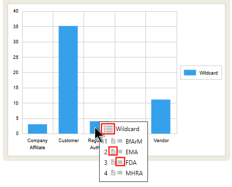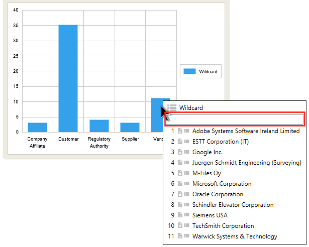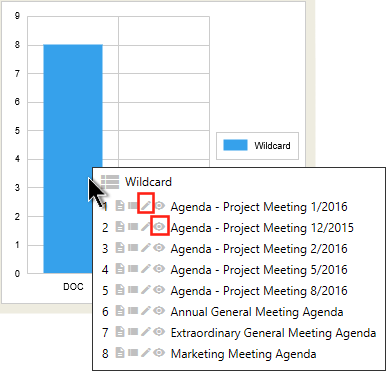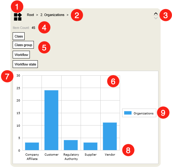 9. Charting Area - The main section of the Smart Node. This area displays the elements of a view that have been processed into a chart. The display of this area depends on the selected charting type. When you hover over a section of the chart, a tooltip opens listing the individual M-Files objects. This listing offers you the following interaction options: