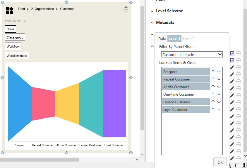 2. Lookup Items & Order - This list contains all values that are included in the selected property. Please note that this is a listing of all values that refer to the selected property, not only those that are actually used in the chart. For example, if you have selected the Workflow State property, all workflow states of the entire vault will be displayed here. Furthermore, you are able to:
